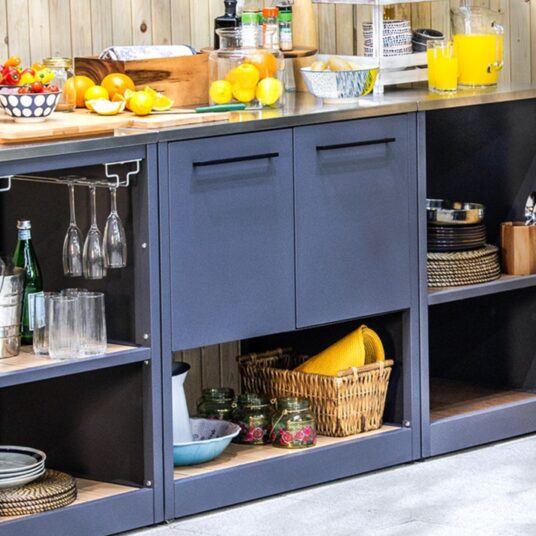 Built for life outdoors, the unit features pre-galvanised steel with a high UV-resistant coating to protect against rust, fading, and the challenges of British weather. Soft-close door hinges add a touch of refinement, while the modern wood-effect slats help it blend naturally with contemporary garden furniture. Adjustable feet ensure the island sits level on any surface, giving you a stable and reliable workspace every time you cook.