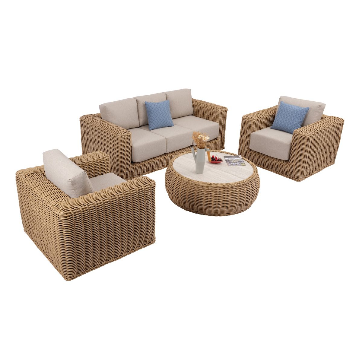 The Driftaway Rattan Style Garden Sofa Set is designed for relaxed outdoor living, combining comfort with a smart, contemporary look. With its natural colour rattan style wicker weave and clean lines, it creates an inviting space for entertaining or unwinding in the garden, patio, or conservatory. The generous seating includes a roomy 3 seater sofa and two spacious armchairs, all paired with soft, supportive cushions for everyday comfort.