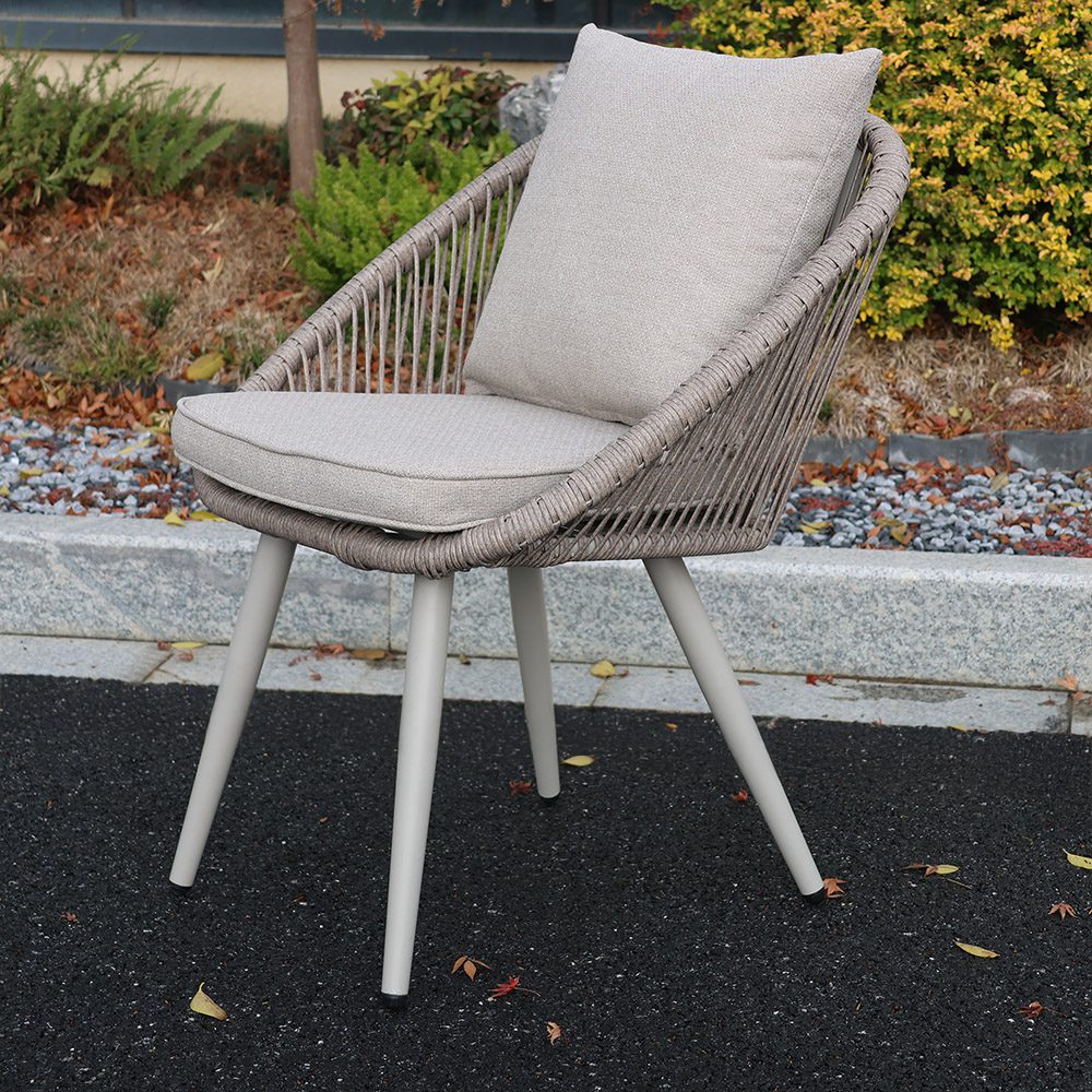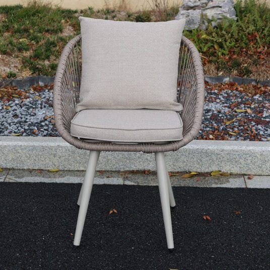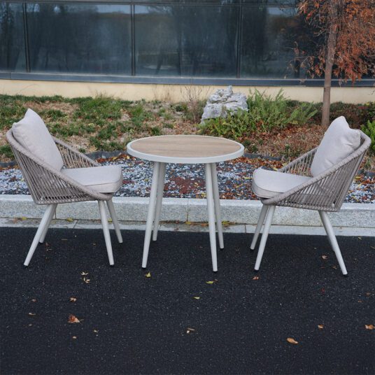 The Millie Aluminium Garden Bistro Set is a stylish and practical choice for relaxed outdoor dining. Designed to suit patios, balconies, and smaller garden spaces, it combines a modern powder coated aluminium frame with rustic rope detailing for a warm, contemporary look. The round bistro table features a natural looking wood composite tabletop, offering the charm of timber with the durability needed for outdoor use.