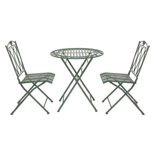 Rustic green metal bistro set with decorative scroll design