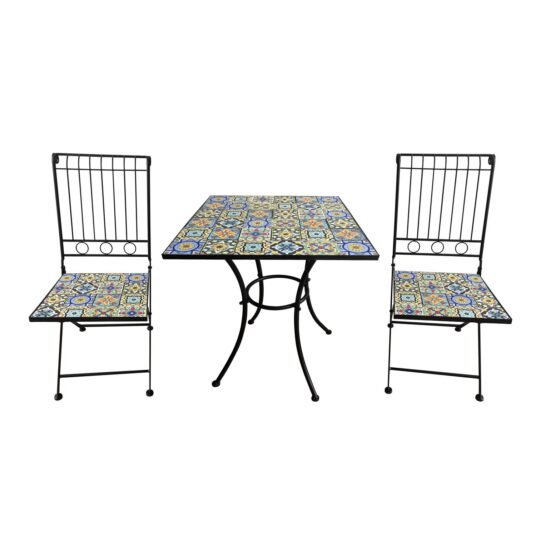 Perfect for enjoying morning coffee or a relaxed afternoon tea, this bistro set combines practicality with traditional elegance. The sturdy chairs provide comfortable seating, while the weather-resistant materials ensure durability throughout the seasons. Whether placed on a patio, balcony, or nestled among flowers, the Tangier Mosaic Garden Bistro Set brings a touch of classic sophistication to your outdoor retreat.