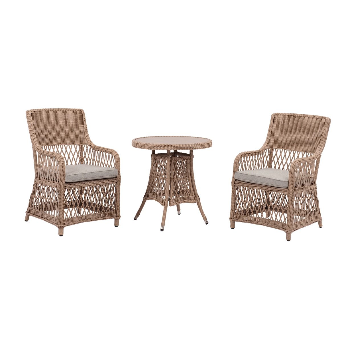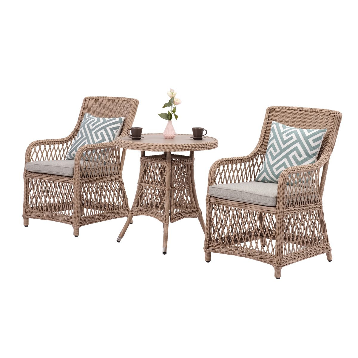 The Verity Rattan Style Garden Bistro Set is a smart and comfortable choice for relaxed outdoor living. Designed with everyday use in mind, it combines a lightweight yet sturdy aluminium frame with a natural-colour rattan style wicker weave that looks great in any garden, patio, or balcony. The two chairs come with comfortable seat cushions, making it ideal for morning coffee or unwinding outdoors.