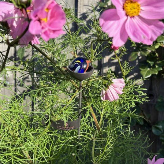 Brighten your garden with the Medium Marble Suncatcher Garden Stake Ornament - Michelangelo. This striking piece features vibrant colours that catch the light beautifully, creating a mesmerising display as it gently sways in the breeze. Standing at approximately 1000mm tall and 40mm wide, it adds both colour and movement to your outdoor space. Versatile as well as decorative, it can also be used indoors to support your favourite plants, making it a charming and practical addition to any home or garden.