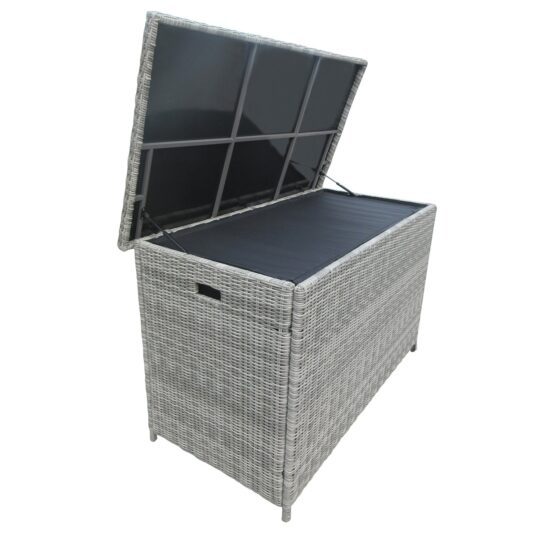 The Tenby Rattan Style Garden Storage Box offers a smart and practical way to keep your outdoor space tidy. Designed with a sturdy aluminium frame and finished in a stylish grey rattan-style wicker weave, it’s built to withstand outdoor conditions while remaining low maintenance and easy to clean. The lid is supported by a gas pump arms for smooth and controlled opening. The included liner adds an extra layer of protection, making it ideal for storing cushions, garden accessories, or outdoor essentials neatly out of sight.