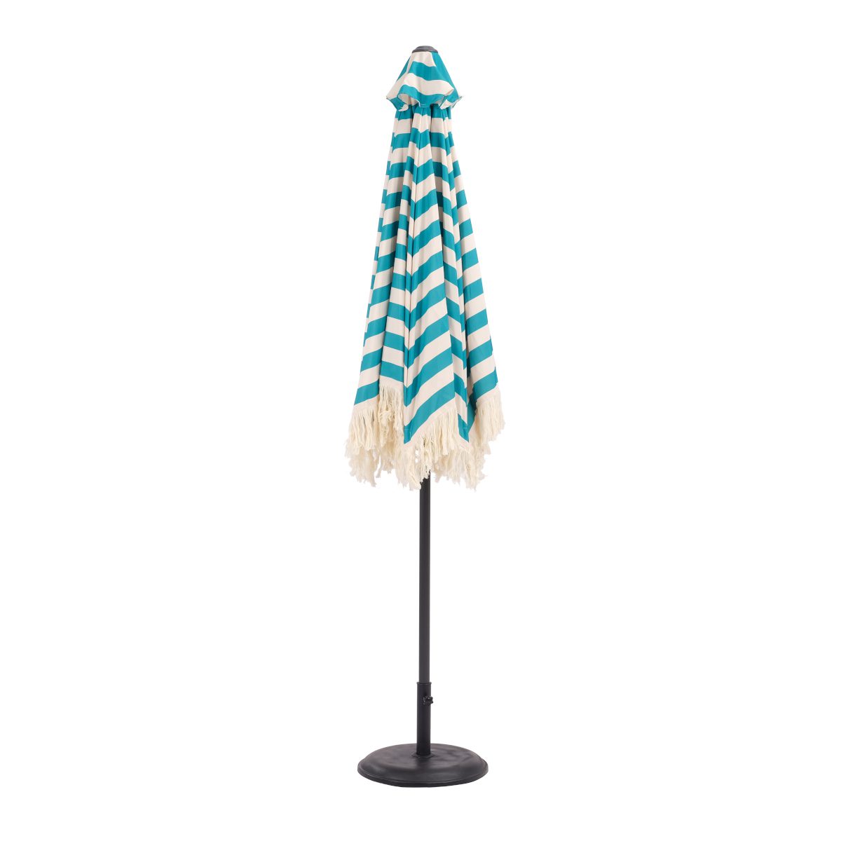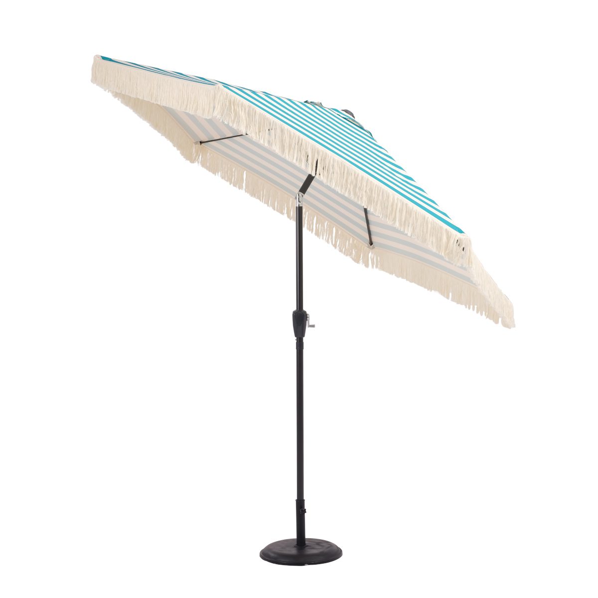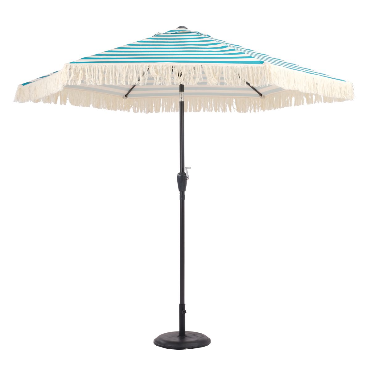 Add a relaxed, boho touch to your outdoor space with the Boho Fringed Garden Parasol in blue. Finished in a rich petrol blue striped fabric and a tasselled fringe, it brings both shade and style to your garden or patio. The aluminium frame keeps it lightweight yet sturdy, while the easy-clean fabric and low maintenance design make it ideal for everyday use. The tilt feature lets you adjust the shade as the sun moves, so you can stay comfortable throughout the day.