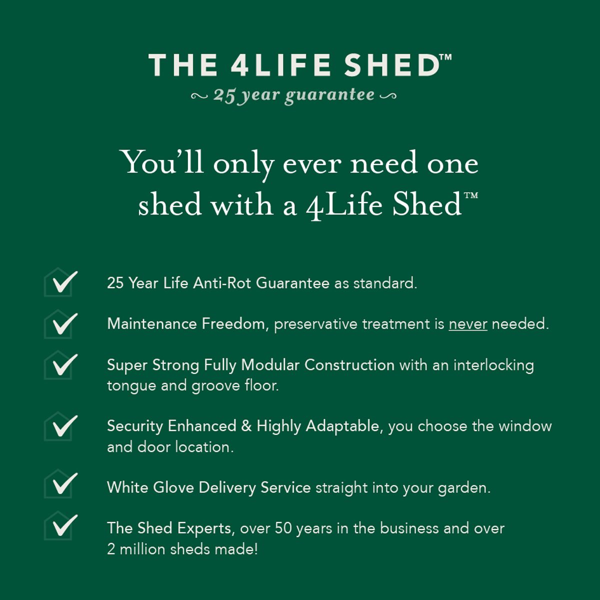 Built to last, the shed features pressure-treated overlap timber with 30% thicker framing than most comparable sheds. The 25-year anti-rot guarantee means you’ll never need to apply preservative treatment, offering true maintenance freedom. A solid timber floor supports heavier items, while the apex roof, finished with green mineral felt, provides robust weather protection. Security is enhanced through a double-Z braced door, hidden hinges, and a hasp and staple latch ready for a padlock. Crafted in the UK from FSC® certified wood, this shed includes professional installation and is delivered with Forest Garden’s White Glove Service, ensuring it’s placed exactly where you want it with all packaging removed.