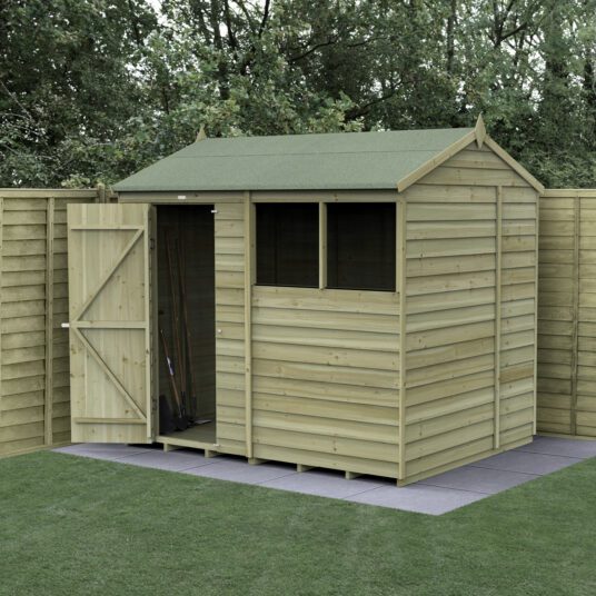 The Forest Garden 4LIFE Reverse Apex Garden Shed 8x6ft with Single Door and Two Windows offers smart, practical storage with exceptional durability. Handcrafted in Britain from FSC® certified timber, this cleverly designed shed features a reverse apex roof, making it perfect for positioning against a wall while maximising usable internal space. Its fully modular construction uses smaller, stronger panels for easier assembly, greater flexibility and improved strength throughout. Ideal for storing tools, outdoor equipment, bikes or gardening essentials, this shed delivers dependable, long-lasting performance with a classic appearance.