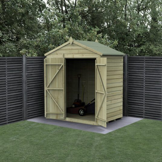 The Forest Garden Beckwood 6x4ft Apex Garden Shed with No Windows is a strong and secure storage solution, built in Britain to handle the British weather. Its traditional apex design and double doors make it ideal for storing garden tools, bikes, outdoor gear, and more. Made with robust, interlocking pressure-treated shiplap cladding, this shed provides a weatherproof and long-lasting finish, while the fully modular design allows interchangeable panels for flexible assembly.
