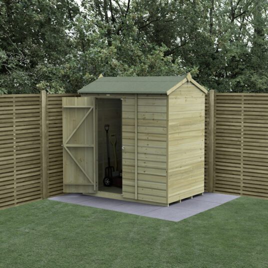 The Forest Garden Beckwood 6x4ft Reverse Apex Garden Shed (No Windows, Installed) combines strength, practicality, and timeless design. Expertly built in Britain for British gardens, this robust shed is crafted from pressure-treated shiplap cladding, offering a watertight, weather-resistant finish. Ideal for storing anything from garden tools and bikes to camping or fishing gear, it’s a smart and durable choice for any outdoor space. The fully modular design uses interchangeable panels for added flexibility and ease of maintenance, ensuring a perfect fit for your garden layout.