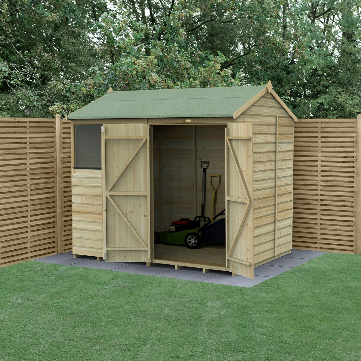 Made from robust, interlocking pressure treated shiplap cladding, the shed provides a watertight seal and long-lasting durability. The 30% thicker framing ensures superior strength, while the pressure treatment offers a 25-year anti-rot guarantee—with no need for annual retreatment. The extra-thick tongue and groove floor easily supports heavier equipment, and the solid sheet roof with green felt covering provides complete weather protection. For security and peace of mind, the double doors feature a double-Z frame, hidden hinges, and a pad bolt ready for your own lock. Delivered and installed by Forest Garden’s professional team, it’s a hassle-free upgrade to your garden storage.