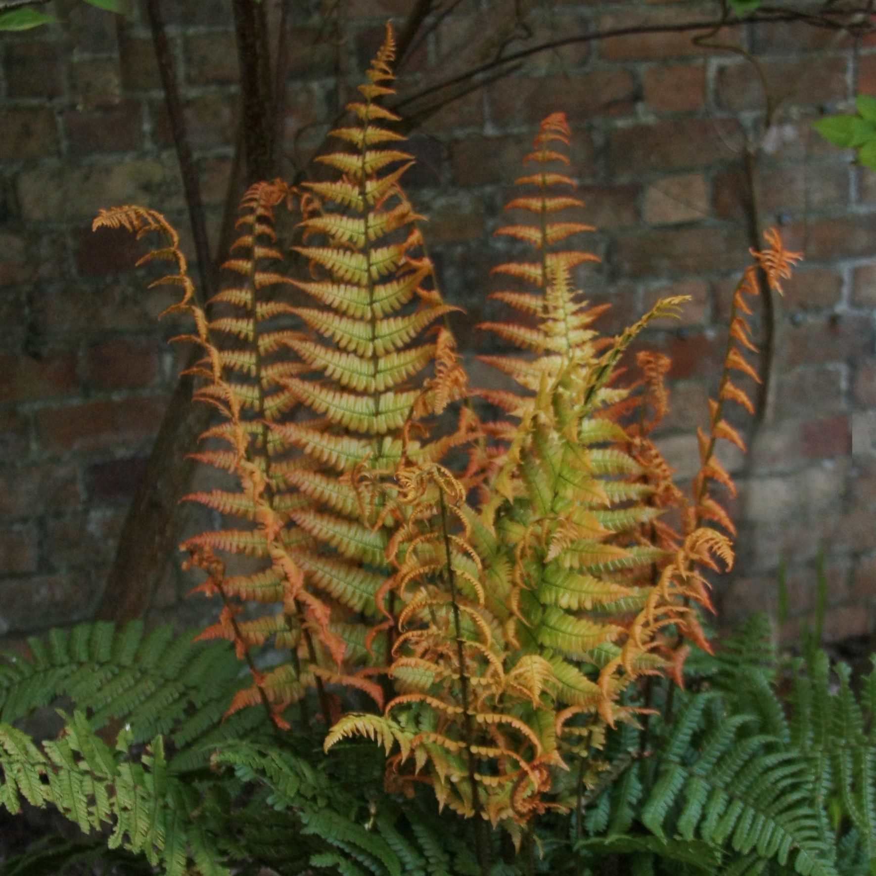 A hardy,deciduous or semi-evergreen fern, forming tufts of erect, lance-shaped, fronds. Very bright golden orange fronds when young fading to green as they mature. Clothed with blackish-brown scales on the stalk and midrib. Ideal in a moist, shady border with other woodland plants.