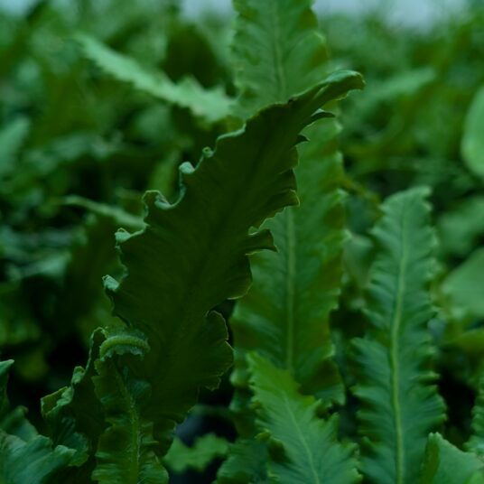 The Hart's Tongue Fern. A hardy, evergreen fern with narrow, glossy green, upright fronds that are heavily ruffled along the edges. A brilliant addition to the edge of water features, mixed borders or woodland areas.