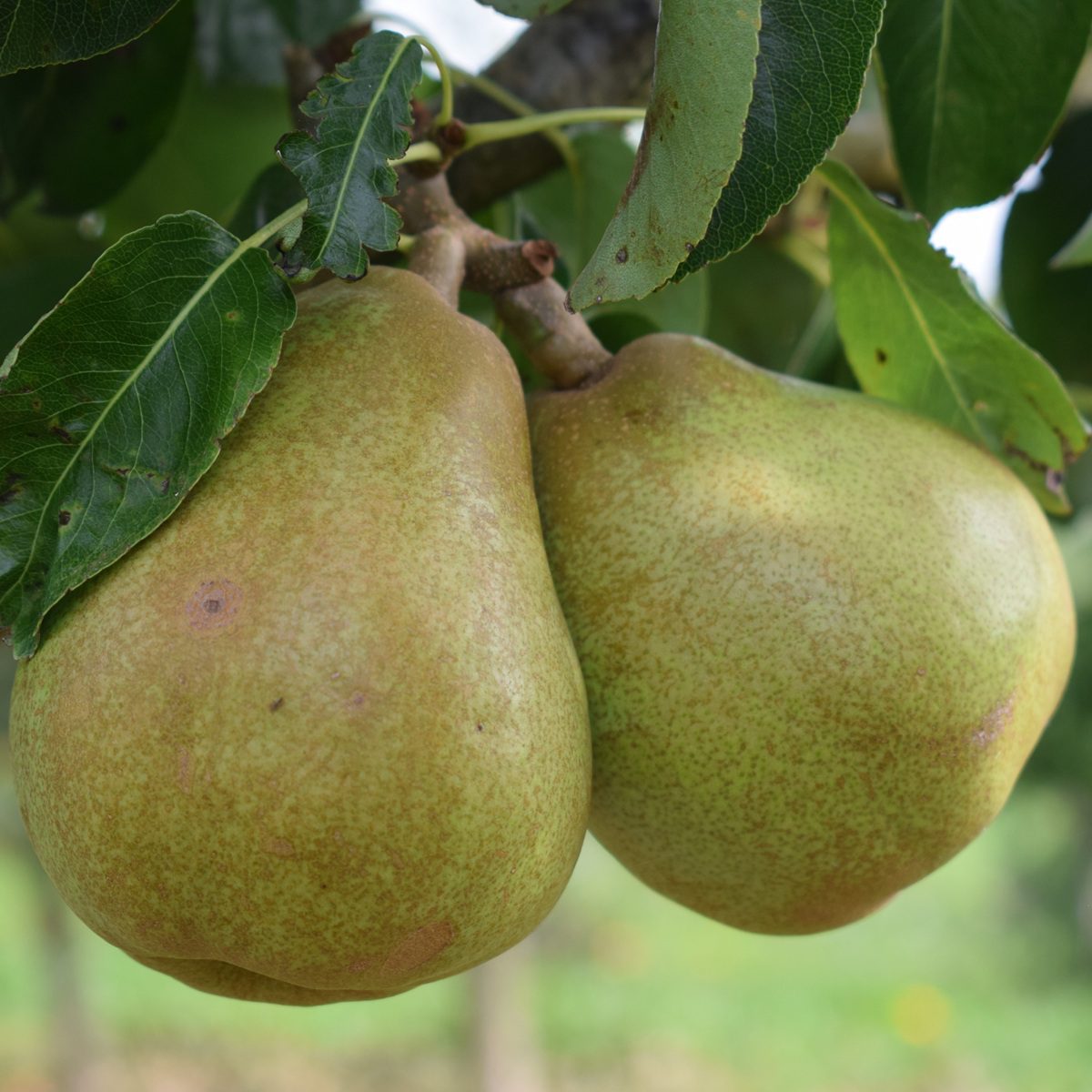 Fruit: Green pears with a red blush and pale yellow, sweet flesh