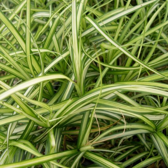 Carex oshimensis 'Evergold' is a hardy evergreen grass, boasting slender, gracefully arching leaves adorned with a striking central stripe of vibrant yellow. During the summer months, the plant produces subtle brown flower spikes, adding a touch of elegance to its overall appearance. This hardy ornamental grass is well-suited for a variety of garden settings, including low-maintenance gardens, borders, as well as pots and containers. Its adaptability and enduring nature make it a versatile choice for those seeking a visually appealing and easy-to-care-for plant.