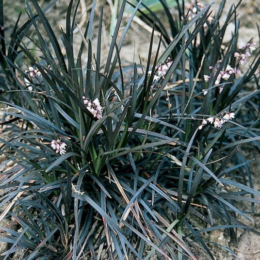 A hardy, clump forming evergreen perennial with inky-purple grass like leaves. Produces in summer small spikes of bell shaped pale mauve flowers which are followed by dark blue fruit. Ideal as a contrast plant in mixed or herbaceous borders or as a patio plant. Suits full sun or partial shade.