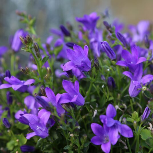 A low growing, hardy, evergreen perennial, with dark-green leaves. Masses of vivid violet-blue, bell-shaped flowers are produced in summer. Perfect for a sunny cottage, herbaceous or mixed border.
