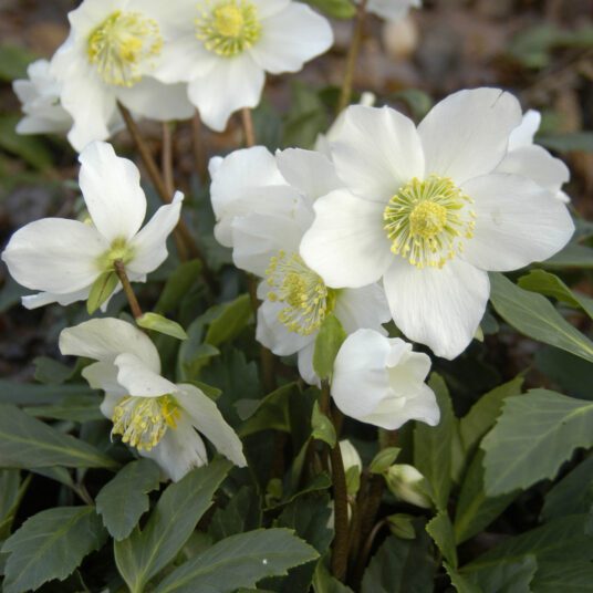 Introduce the enchanting elegance of Helleborus niger HGC 'JOEL,' an hardy semi-evergreen perennial plant. This exceptional Hellebore variety features striking, pristine white blossoms adorned with intricate yellow centres with leathery dark green leaves creating a captivating and festive display. 'JOEL' thrives in well drained soil and partial to full shade making it perfect for shaded borders, woodland gardens or holiday containers. Low maintenance and deer resistant it requires minimal pruning, mainly to remove faded flowers and damaged leaves. Keep the soil consistently moist but not waterlogged to encourage optimal growth.