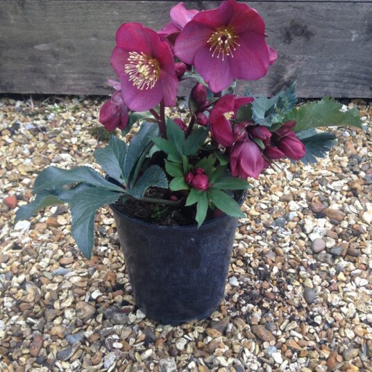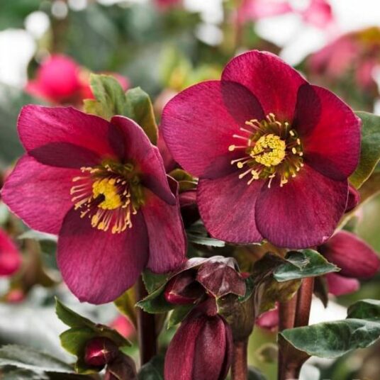 The evergreen beauty of Helleborus HGC 'Ice N Roses Red,' an exquisite perennial plant will bring charm to your garden year after year. This remarkable Hellebore variety showcases striking, nodding flowers in rich shades of velvety red with dark green leathery leaves, creating a stunning display in late winter and early spring. This thrives in well drained soil and partial to full shade making it ideal for shaded borders, woodland gardens or containers. Low maintenance and deer resistant, it requires minimal pruning primarily to remove faded flowers and damaged leaves. Keep the soil consistently moist but not waterlogged to ensure optimal growth.