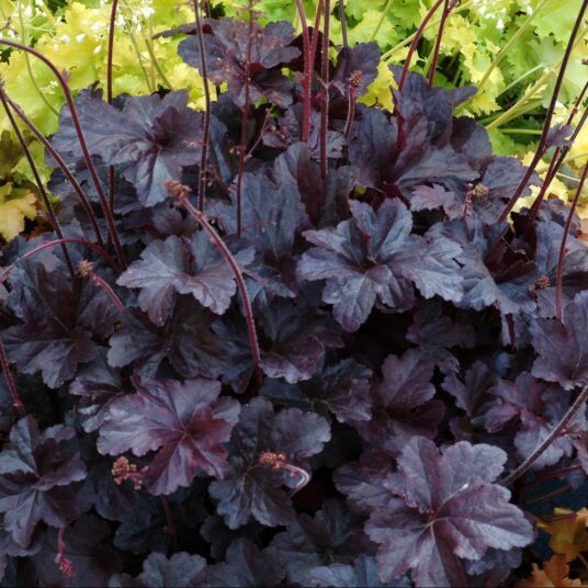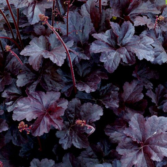 The Heuchera Obsidian is a striking perennial renowned for its dramatic near black glossy leaves contrasting with clusters of cream flowers which appear June-July on wiry stems. This versatile plant thrives in partial shade and adapts well to different soil types in landscapes, provided they're well draining. Keep the soil consistently moist but not waterlogged. Remove spent flower stalks for a tidy appearance. As the Obsidian is low maintenance it's an ideal choice for borders, rock gardens or containers in many gardens and outdoor spaces for both expert and novice gardeners.