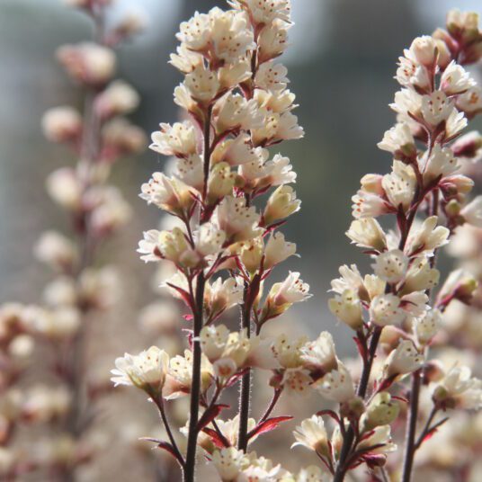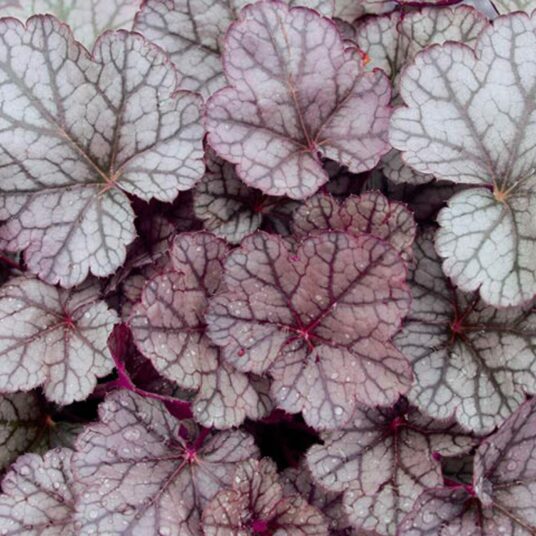 A hardy, evergreen perennial with rounded, dark purple to burgundy leaves with silver, metallic markings forming a neat mound. Loose panicles of cream flowers held on slender stems produced in summer. Great in a mixed border, rock or gravel gardens and ideal in a patio pot.