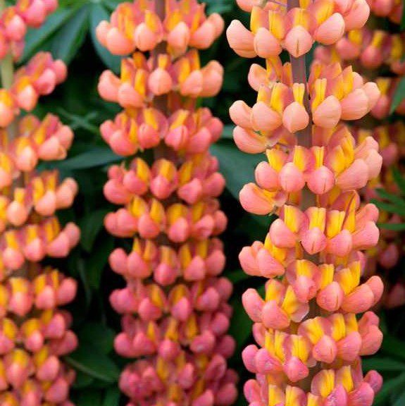 A hardy, upright, clump-forming perennial, with palmately-divided green leaves. In early to midsummer, produces upright spires of closely packed peach flowers with yellow and pink upper petals . Ideal for giving height and colour to the herbaceous or mixed border.