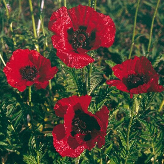 A hardy perennial with dense rosettes of blue-green leaves. From late spring, large scarlet flowers with a deep black cross in the centre are produced. Wonderful in mixed borders, rock and gravel gardens. Attractive to pollinators.