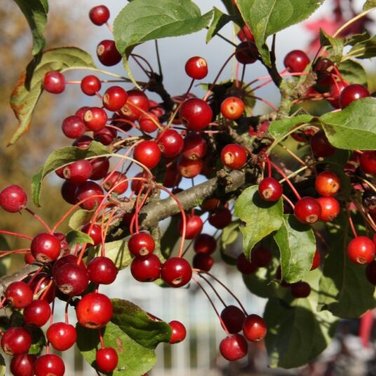 ✔ Attractive fruits – Dark red crab apples persist through winter
