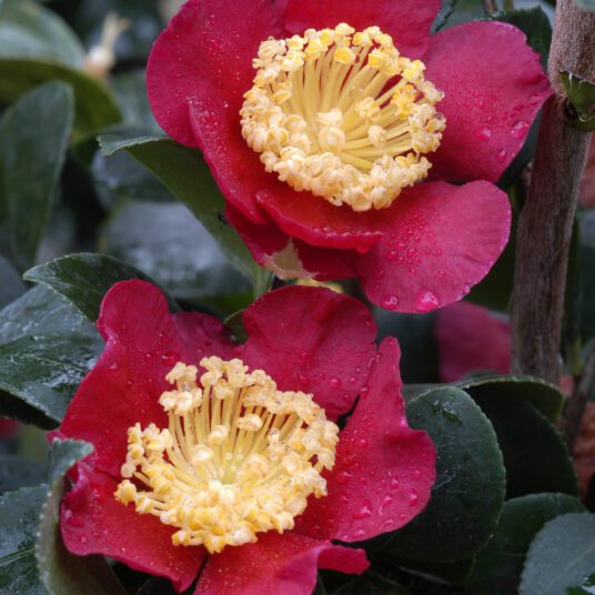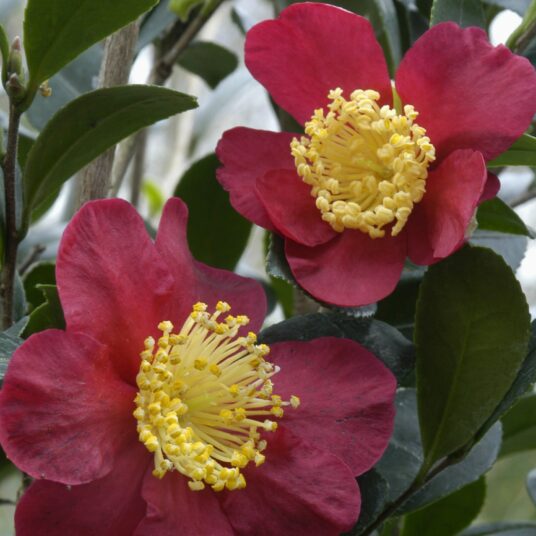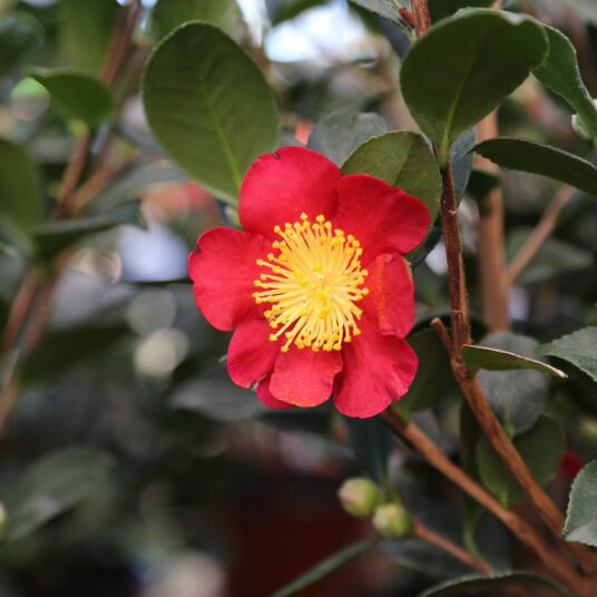 The exceptional evergreen shrub Camellia vernalis 'Yuletide' is a burst of vibrant colour with red single blooms with golden stamens standing out in any garden or outdoor space. This thrives in partial to full shade making it a versatile choice for shaded areas all year round. Its low maintenance nature invites gardeners of all levels to partake in its beauty. When planting select a shaded spot with well drained acidic soil. Maintain consistent soil moisture without waterlogging. Apply mulch for moisture retention, prune after flowering for desired shape and provide protection from harsh winter winds.