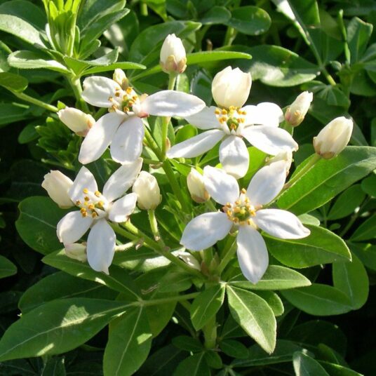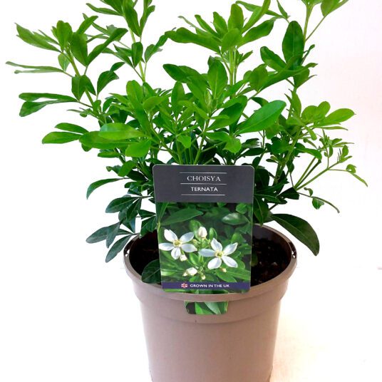 This evergreen hardy shrub, Choisya ternata will look beautiful in any garden or outdoor space. Also known as Mexican Orange Blossom this plant boasts glossy foliage and fragrant white flowers in late spring and often again in autumn, bringing a touch of elegance and fragrance to any landscape. This will thrive in well drained soil with full to partial sun making it adaptable to various garden settings. Low maintenance and relatively drought tolerant this will require minimal pruning to maintain its shape. Water regularly especially during dry spells to ensure optimal growth.