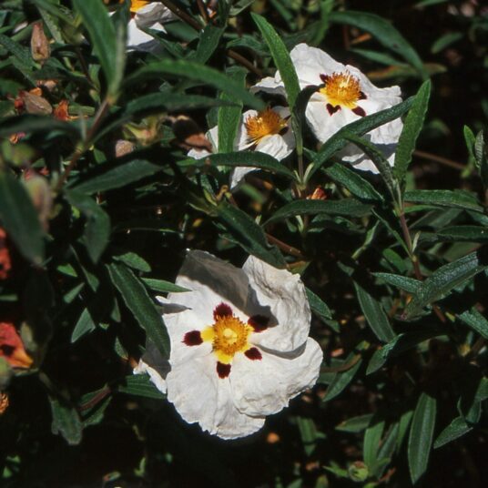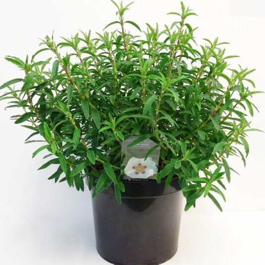 A hardy, rounded, evergreen shrub with mid-green leaves. It bears white flowers with a dark purple blotch at the base of each petal and a golden boss of stamen in summer. Drought tolerant once established, works well in a border or a patio pot.
