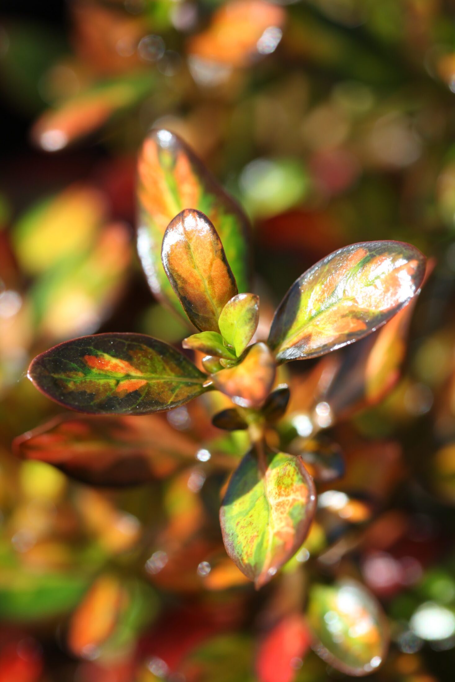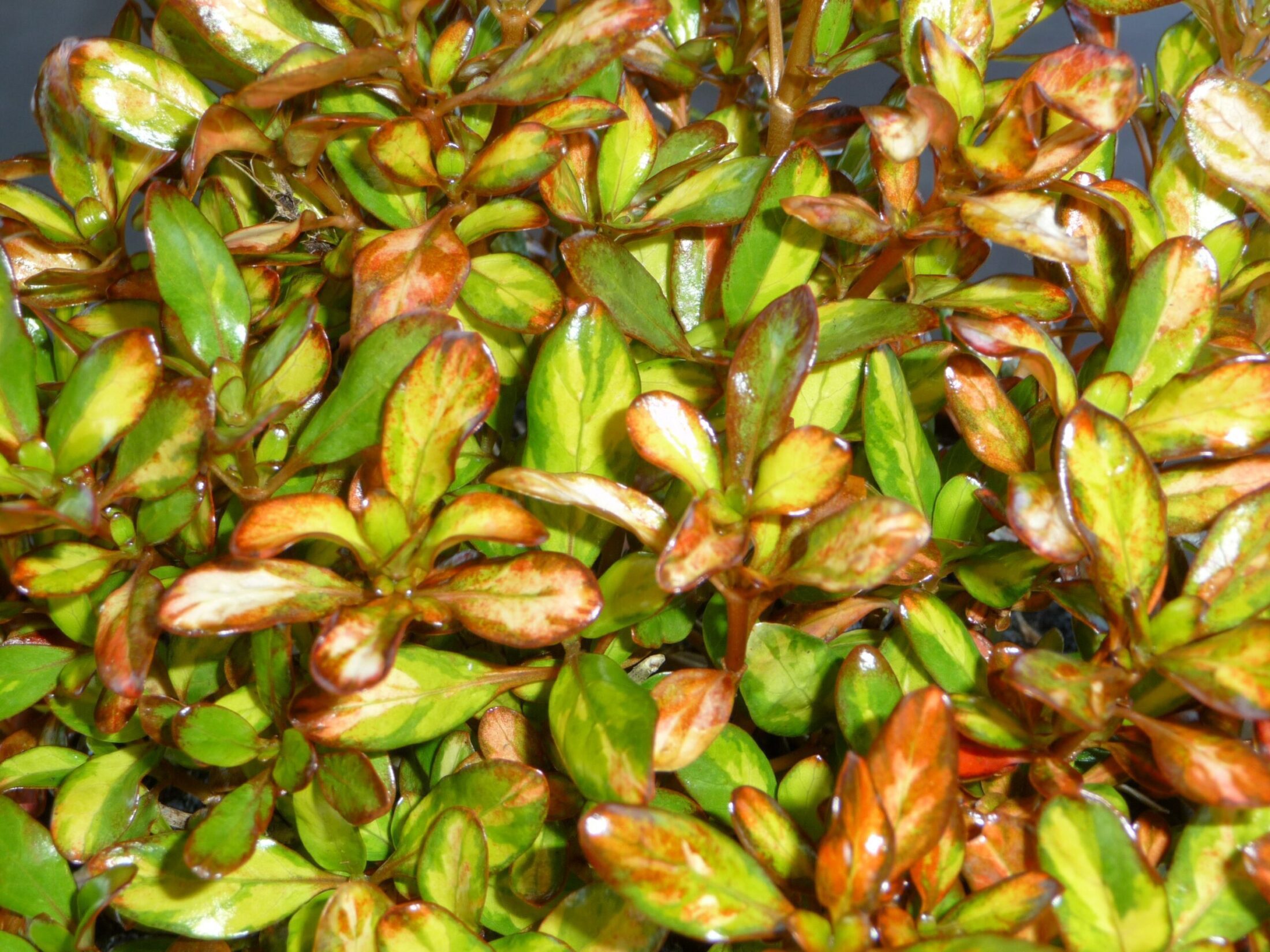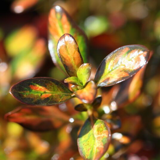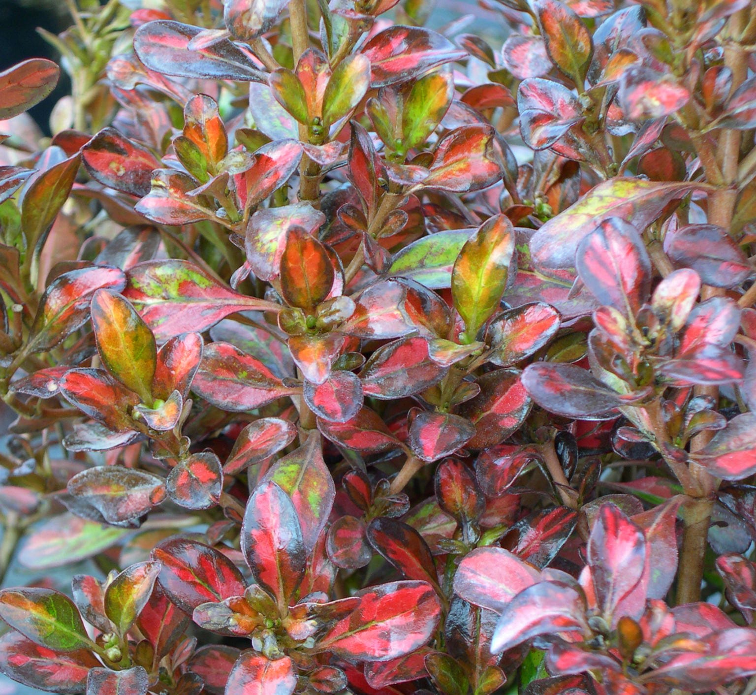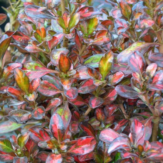 A compact, upright, evergreen shrub with glossy, green leaves with yellow spots, turning into orange hues in cold weather. A great low-maintenance container or border plant.