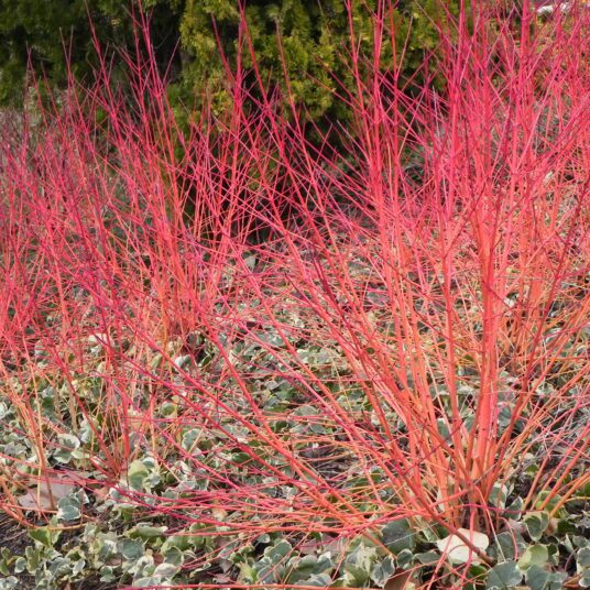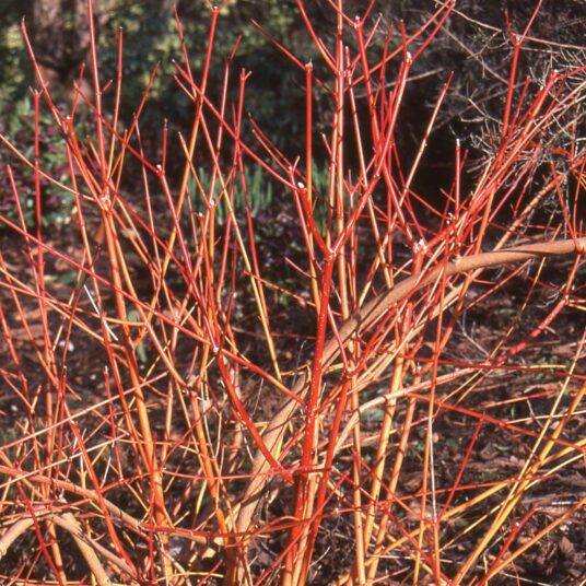 A hardy, deciduous shrub grown for its colourful stems in autumn and winter. Bright orange-red stems are covered by the mid-green leaves until they turn red in autumn and fall. Dense clusters of white flowers in summer are followed by blue-black fruit in autumn. Low maintenance, easy-to-grow in mixed beds and borders.