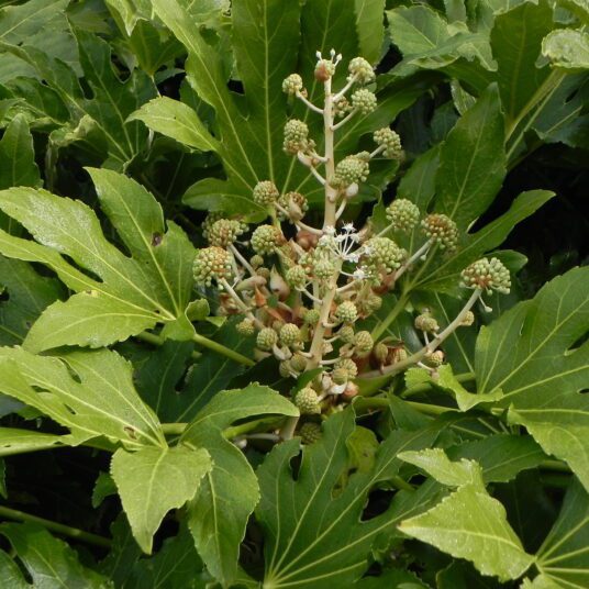 Fatsia japonica, commonly known as the Japanese Aralia is a striking evergreen shrub that adds a touch of exotic beauty to your garden or landscape. With its large, glossy, palmate leaves and elegant architectural form it creates a lush, tropical ambiance in any outdoor setting. Fatsia japonica thrives in partial to full shade and well drained soil, making it ideal for shaded garden spots. Regular watering and occasional pruning to maintain its shape are all it requires. This hardy plant brings all year round greenery and a touch of the Orient to your landscape, making it a perfect choice for both novice and experienced gardeners seeking low maintenance elegance.