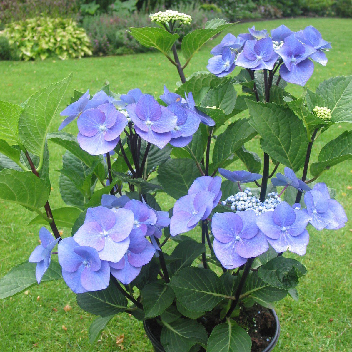 A hardy, vigorous deciduous shrub with glossy ovate dark green leaves borne on deep purple-black stems. The large flat ultramarine lace cap flowers are produced in summer. Great for a mixed border or in a container.