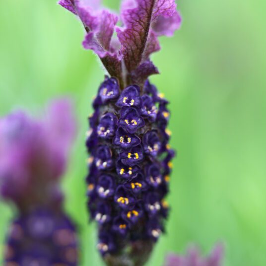 Lavandula 'Regal Splendour' is a lively evergreen lavender with upright stems that carry slender, fragrant, grey-green leaves. During spring, it graces gardens with delightful spikes of dark purple-violet flowers, crowned with rich, dark purple bracts. This plant not only adds charm to borders but also thrives in patio pots, drawing the admiration of buzzing bees.