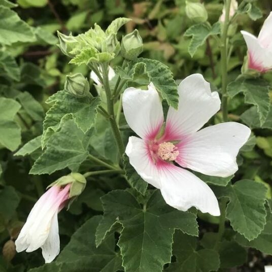 A hardy, semi-evergreen shrub with rounded, lobed, grey-green leaves. In summer masses of funnel-shaped, white flowers with red centres are produced. Beautiful in borders or in patio pots, adored by bees.