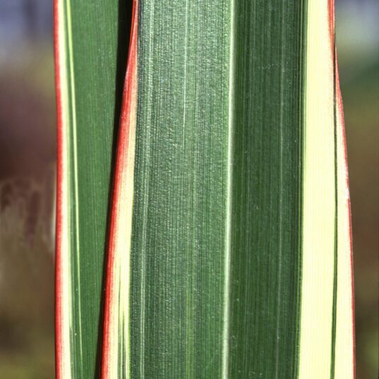 A hardy, clump-forming evergreen shrub with sword-shaped leaves striped with yellow and green and red. Flowers yellowish-green, in large panicles appear on mature plants in summer. Adds shape or texture to the mixed border. Looks good growing through gravel and in containers.