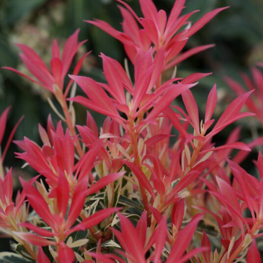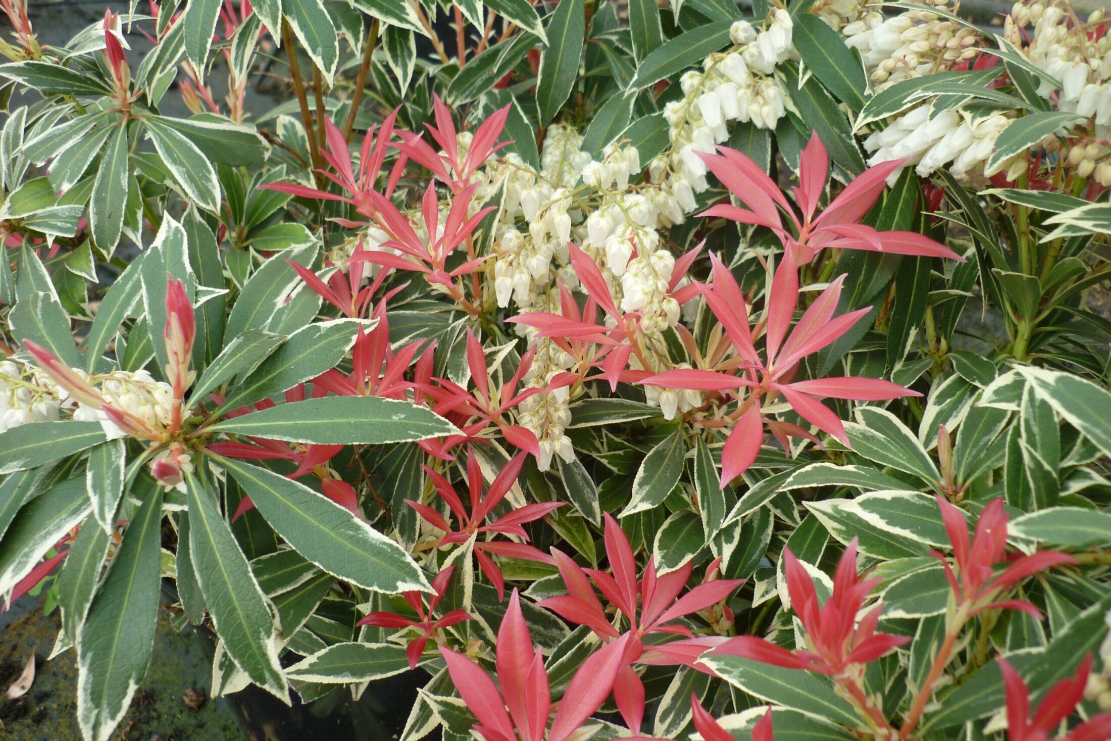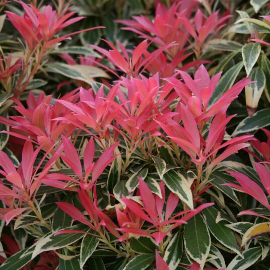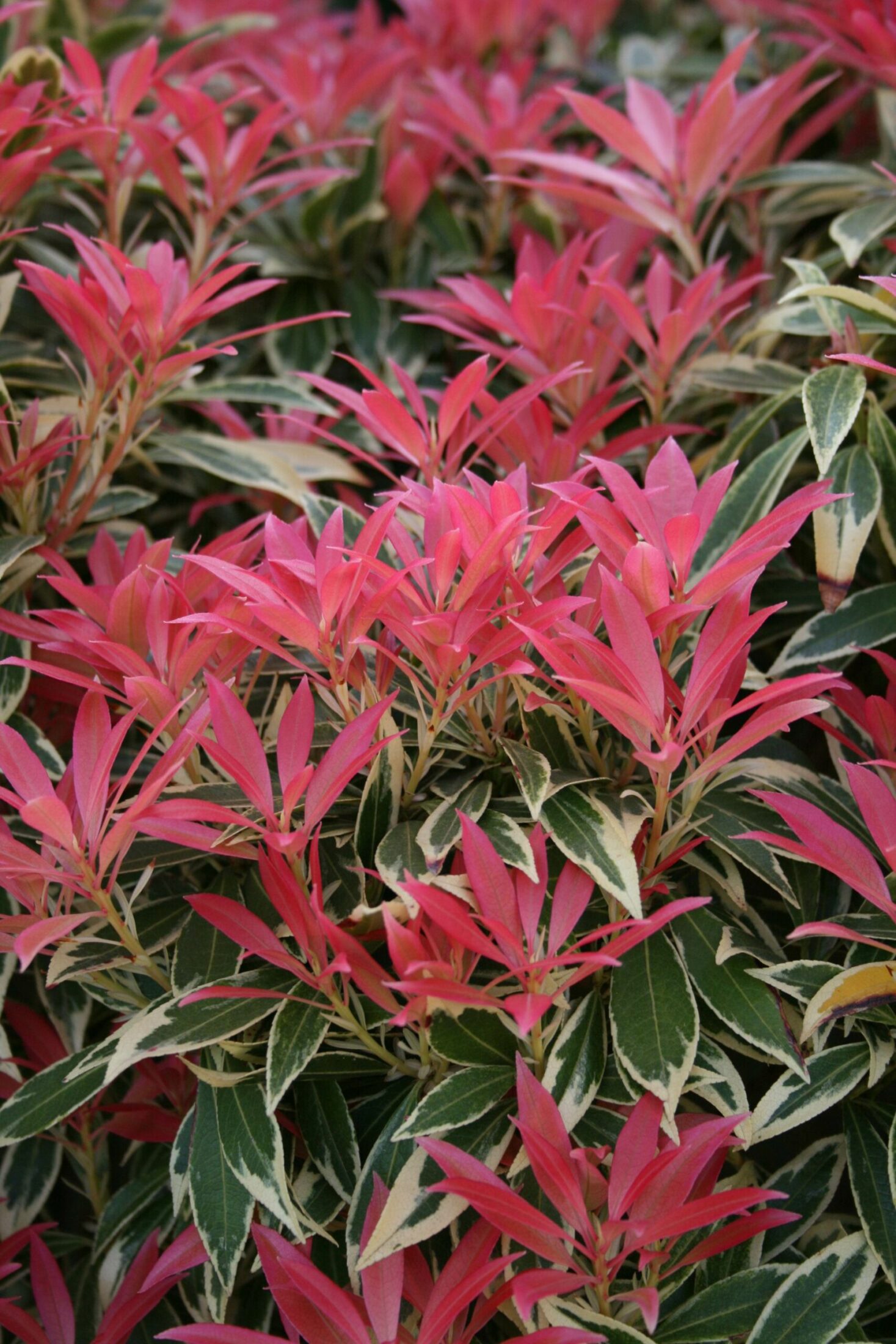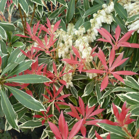 A hardy, upright evergreen shrub, the young foliage bright red, becoming green, boldly margined with silvery-white. Small creamy-white bell-shaped flowers in branching clusters produced in spring. Low maintenance shrub for mixed borders, ideal for patio pots and containers.