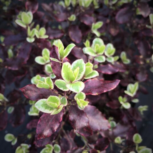 The graceful beauty of Pittosporum tenuifolium 'Bannow Bay' perennial hardy shrub will elevate your garden. This exceptional variety showcases burgundy mound new shoots emerge in spring with green leaves edged in silver, fading through summer into a mottled green and burgundy effect returning to a rich deep burgundy through the winter months. 'Bannow Bay' thrives in well drained soil and full sun to partial shade making it adaptable to various landscape settings from hedges to specimen plantings. Low maintenance and hardy it requires minimal pruning, primarily for shaping or removing damaged branches. Ensure the soil stays consistently moist during its establishment period.
