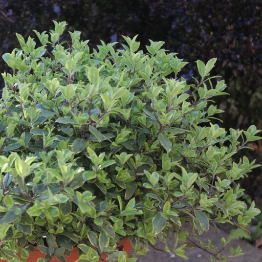 Pittosporum tenuifolium 'Glo Ball' is a captivating evergreen shrub that adds a touch of brilliance to any garden or outdoor space. Its rounded, glossy leaves boast stunning variegation with shades of green and cream resembling twinkling stars. This low maintenance shrub thrives in well drained soil and prefers a sunny to partially shaded location. 'Glo Ball' requires minimal care, with occasional pruning to maintain its shape and height. It is generally resistant to pests and diseases. Keep the soil consistently moist, especially during dry spells. This unique and visually striking plant illuminates your outdoor space with its luminous foliage, making it a standout feature in your landscape.