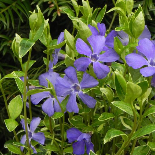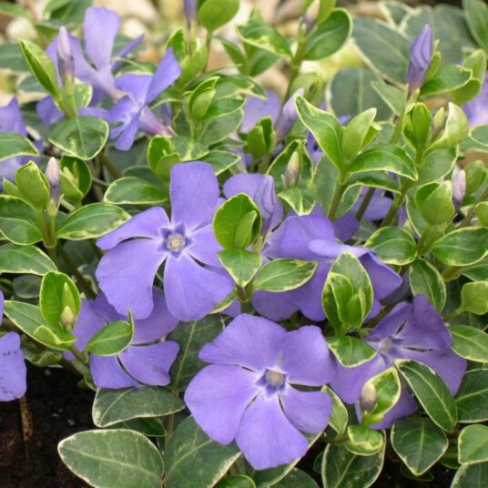 A hardy, evergreen, mat-forming shrub with dark green leaves that have a narrow white border. Masses for salver shaped flowers are vivid, deep violet when produced in spring. Easy-to-grow, forms extensive carpet - excellent groundcover.