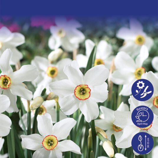 Elevate your outdoor space or garden with this unusual Daffodil with white petals surrounding a yellow cup fringed with red. The Pheasant Eye Daffodil is great for naturalising and will enhance the look of your garden.