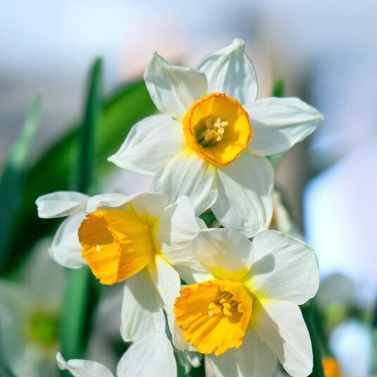 Daffodil Sempre Avanti bulbs produce striking cut flowers with a vibrant blend of white, orange, and red. Perfect for adding a splash of colour to borders and pots, these daffodils also attract pollinators like bees and butterflies. They bloom from April to May, offering a cheerful display in your garden or home.