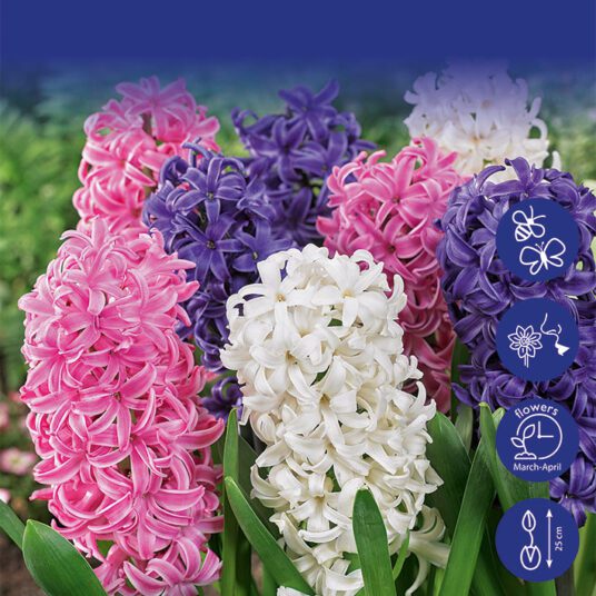 Create a vibrant garden with this mix of Hyacinth Garden bulbs. They will burst an array of colours and sweet fragrances, flowering early spring looking sensational in borders, beds and pots in any garden or outdoor space.