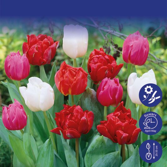 Energise your garden with Tulip Bulbs 'Early Mixed.' This diverse blend of bulbs produces a vibrant array of tulips that bloom early in the season. With a dynamic mix of reds, pinks and whites 'Early Mixed' tulips will bring a burst of beauty to your outdoor space.