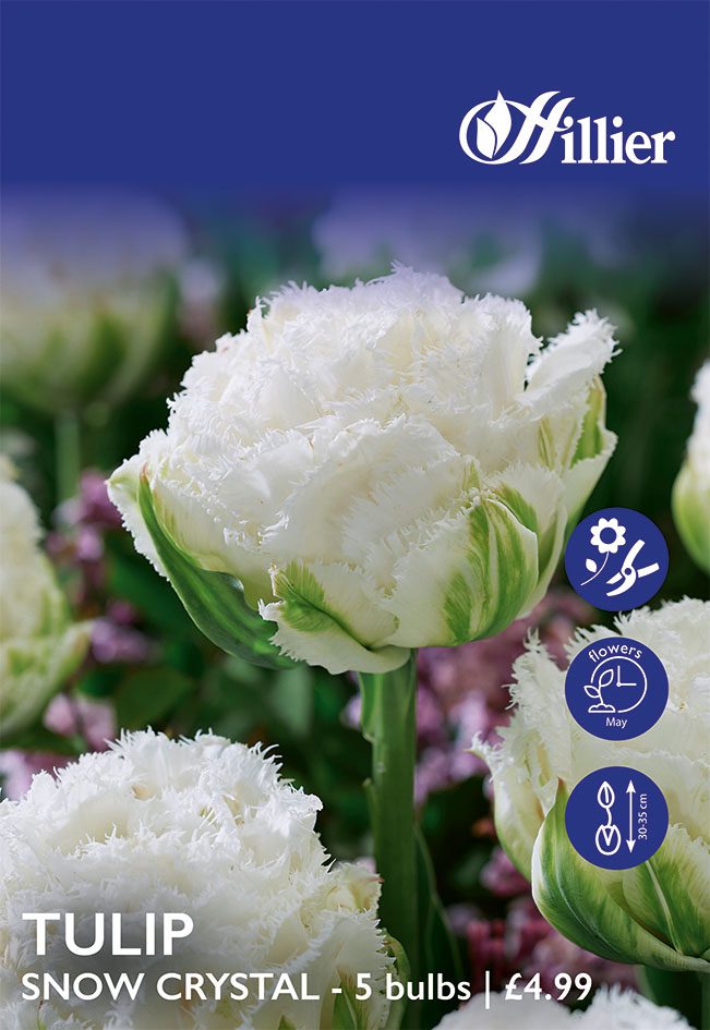 These distinctive Tulip bulbs 'Snow Crystal' will blossom in your garden showcasing white flowers with bright green leaves. These flowers look lovely when planted together and will bring brightness to any outdoor area or landscape. They are low maintenance, hardy and will look great in beds or pots in any garden.