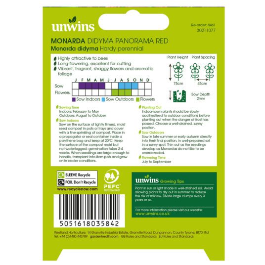 Nature’s Haven Monarda didyma Red Shades Panorama Red produces abundant shaggy crimson blooms held on tall, elegant stems, creating a bold splash of colour in summer borders. This hardy perennial is loved by bees and other pollinators, while both the flowers and aromatic foliage release a deliciously spicy, summery fragrance. Sow indoors from February to May or outdoors from August to October, then enjoy striking red flowers from July through to September year after year.