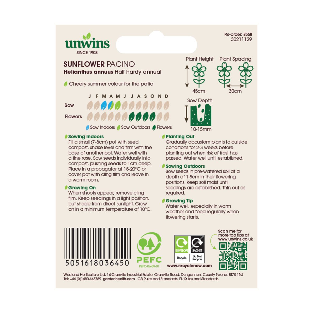 Unwins Sunflower ‘Pacino’ Seeds produce a compact, dwarf sunflower with real impact, forming bushy plants covered in multiple bright yellow blooms. Ideal for pots and smaller spaces, this half hardy annual delivers a long-lasting summer display from July through to October. Easy to grow, it can be sown indoors in March and April or directly outdoors in April and May, and is a lovely choice for adding colour while also attracting pollinators to your garden.