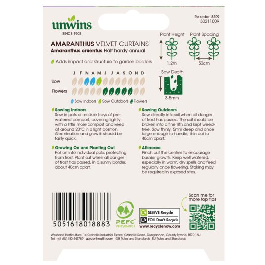 Unwins Amaranthus Velvet Curtains Seeds produce striking red-purple foliage topped with tall, dramatic crimson flower plumes that add real impact to sunny borders. This award-winning half-hardy annual brings bold colour and height to garden displays, flowering from early summer right through to autumn. Sow indoors in March and April or outdoors in May, and enjoy a long season of eye-catching blooms from June to October.