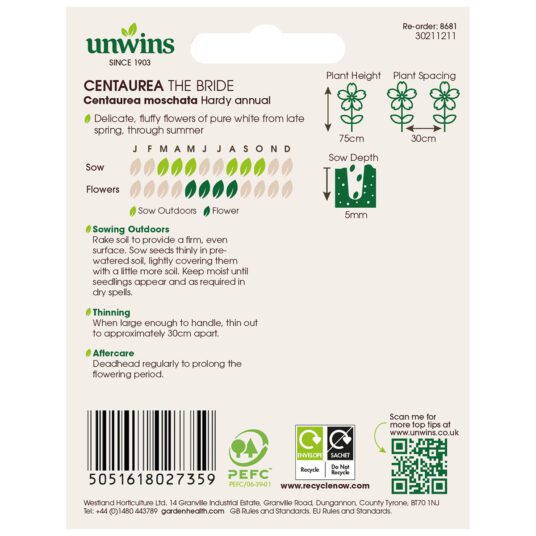 Unwins Centaurea The Bride Seeds produce masses of fluffy, pristine white flowers with a light, delightful scent, bringing a fresh, elegant look to borders and cutting gardens. This hardy annual flowers from late spring through summer and is ideal for snipping, with long-lasting blooms that look beautiful in arrangements. Easy to grow and reliable, it can be sown indoors or directly outdoors, rewarding you with clouds of soft white flowers from May right through to August.